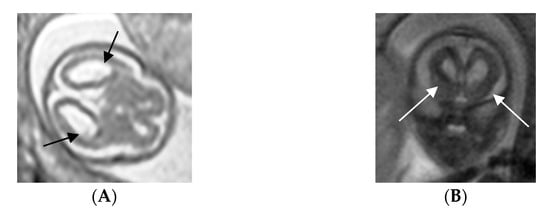 MRI section of fetal brain with arrows displaying lateral ventricular enlargement (A) and increased thickness of the germinal matrix (B) at 15 weeks of gestation.
