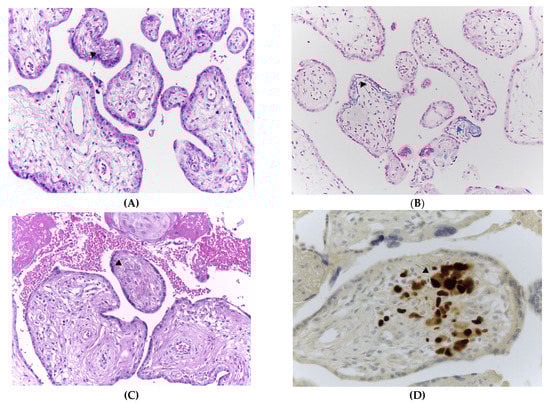 Placenta histological examination with arrows displaying: (A) Increased stromal fibrosis, decreased number of capillaries and presence of lymphocytes and plasma-cells (H&E stain, 200× magnification). (B) Hemosiderin depositions on trophoblastic basal membrane (Perls staining positive, 200× magnification). (C) Cytomegalic stromal cells with eosinophil intranuclear inclusion bodies (H&E stain, 200× and 400× magnification). (D) Immunostaining for CMV immediate early (IE1/2) antigens displaying a strong and diffuse nuclear positivity (400× magnification).