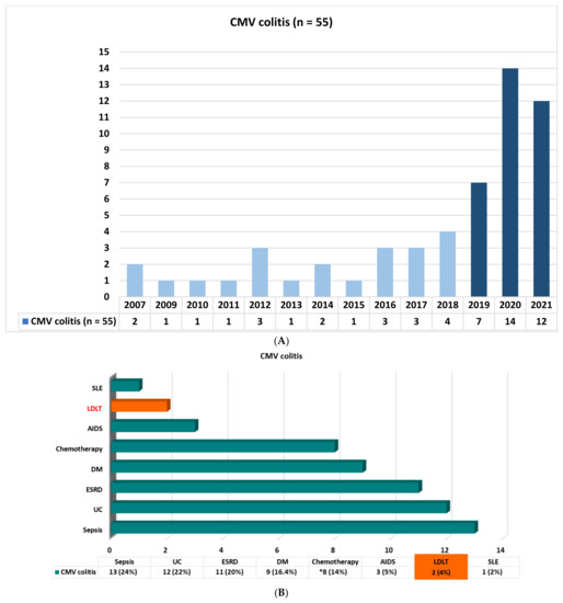 From January 2007 to December 2021 in Kaohsiung Chang Gung Memorial Hospital, a total of 1630 cases underwent LDLT in the period 2007–2021, with only two recipients confirmed to have CMV colitis via histologic examination in 2021 (2/114, 1-year incidence: 1.75%). In this 15-year study period, a total of 55 cases with endoscopic biopsy-proven cytomegalovirus colitis were enrolled for analysis and comparison: 33 cases (60%) were diagnosed in the period 2019–2021 (Figure 1A). The underlying associated diseases of all patients in this cohort were as follows: sepsis (n = 13, 24%), ulcerative colitis (n = 12, 22%), end-stage renal disease (n = 11, 20%), diabetes mellitus (n = 9, 16.4%), chemotherapy for colon cancer/cancer of non-gastrointestinal tract (n = 2, 3.6%/n = 6, 10.9%), acquired immunodeficiency syndrome (n = 3, 5%), living donor liver transplantation (n = 2, 4%), and systemic lupus erythematosus (n = 1, 2%) (Figure 1B).