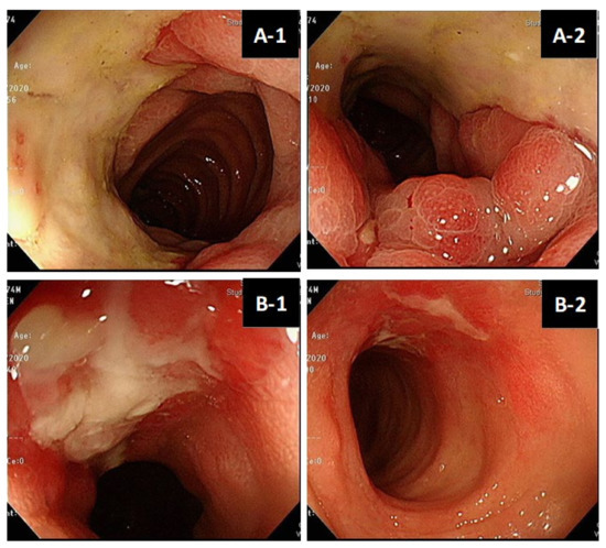 - Yoon, J.; Lee, J.; Kim, D.S.; Lee, J.W.; Hong, S.W.; Hwang, H.W.; Hwang, S.W.; Park, S.H.; Yang, D.H.; Ye, B.D.; et al. Endoscopic features and clinical outcomes of cytomegalovirus gastroenterocolitis in immunocompetent patients. Sci. Rep. 2021, 11, 6284. [Google Scholar] [CrossRef]