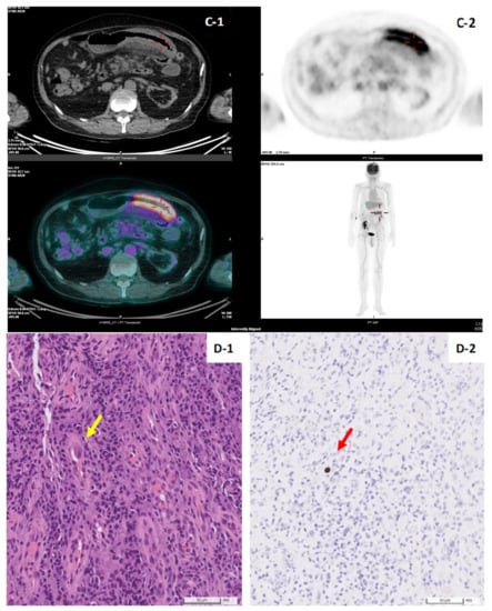 (A,B). Colonoscopy features of living donor liver transplant patient No.1. Well-demarcated longitudinal ulceration (around 3 cm in diameter) in descending colon with colonic mucosa edematous change and bowel wall thickening, causing intra-luminal narrowing (A-1,A-2). Remission of ulceration 2 weeks later after antiviral therapy follow-up (B-1,B-2). (C). Positron Emission Tomography/Computed Tomography (PET/CT) of patient No.1. PET/CT illustrated segmental colon wall thickening at distal T-colon and proximal D-colon by CT scan (C-1, arrow) and increased FDG uptake in the colon wall, SUV max:7.6 by PET (C-2, arrow), respectively. (D). Histopathology of CMV colitis in patient No.1. Histological hematoxylin and eosin staining (×40 objective) detection of CMV inclusion bodies (owl’s eye) (yellow-arrow), biopsy specimen of an ulcer at descending colon (D-1). Positive CMV immunohistochemistry (IHC) staining (×40 objective) (red-arrow) (D-2).