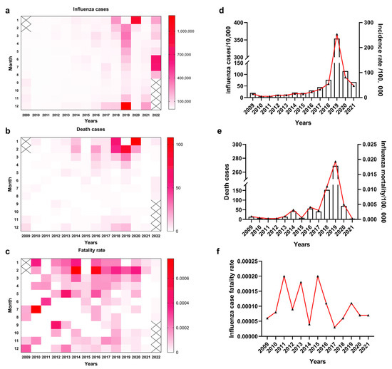 With a total population of more than 1.4 billion, the burden of influenza morbidity and mortality in mainland China is high. According to the data on influenza infections and deaths in mainland China from March 2009 to August 2022 (as of 17 November 2022, Figure 1a,b) reported by the Bureau of Disease Prevention and Control of the National Health and Health Commission, the influenza epidemics and influenza-related deaths were concentrated mainly in the winter season (January–March and November–December), and the incidence of influenza was reported to be the lowest in the July–October period. The 2019 influenza epidemic was severe and longest-lasting, in February-June as well as November-December, with the highest number of influenza cases in December, about 1.2 million people (Figure 1a). The following January had the highest number of deaths at 108. It was reported that influenza-related deaths were concentrated in the January–March and November–December periods (Figure 1b), but the influenza case fatality rate showed no seasonal pattern (Figure 1c).