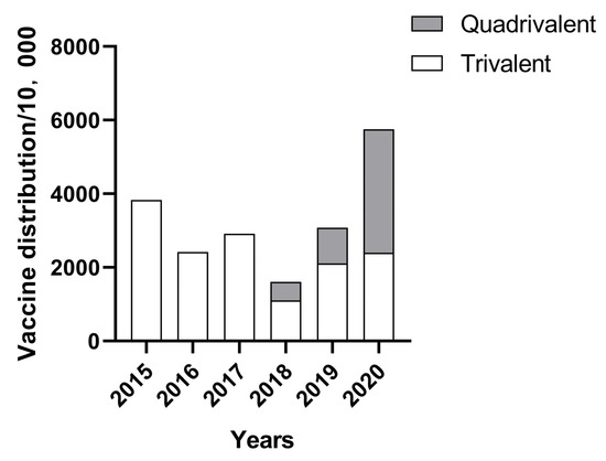 The statistics of the batch issue volume of China’s influenza vaccine industry from 2015 to 2020 are shown in Figure 2. The batch issue volume of China’s influenza vaccine in 2018 was 16,123,900 doses, which was the lowest in recent years. This increased in 2019, with an influenza vaccine batch issue volume of 30,784,200, 14,660,300 doses more than the previous year. The batch issue volume of the influenza vaccine in 2020 reached 57,519,900 doses, an increase of 26,735,700 doses over the previous year, and the number of approved influenza vaccines will not be announced after 2021 [9]. China’s quadrivalent influenza vaccine was first approved for marketing in 2018, and according to statistics, 5,122,500, 9,710,500 and 33,582,300 doses were approved during 2018, 2019 and 2020, respectively. The number of quadrivalent influenza vaccines issued has increased year by year since its launch, with the proportion exceeding that of trivalent influenza vaccines in 2020, reaching 58.38%.