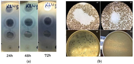 In this study, the phages and host were incubated for a prolonged period during plaque assay to observe their depolymerase activity. Large halos were observed on bacterial lawns and gradually increased their size over time. Figure 1a shows a lawn of K. pneumoniae containing plaques from K2w5 as an example. The size of k2w5 plaque increased by 0.5–1 mm and the halo size increased by 3–6 mm when plaques were further incubated for 72 h. As shown in Figure 1b(a1,b1), clearings (plaques) were formed on the bacterial lawns due to the inhibitory effect of the bacteriophages against the hosts. We did not observe bacterial growth within the plaques, indicating that the phages successfully killed the hosts. The bacteriophages exhibited varying levels of depolymerase activity as indicated by the variations in the diameters of the halos. We show the plaques with and without halos in Figure 1b(a2,b2), respectively.