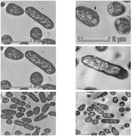 Observation of Klebsiella pneumoniae under TEM showed drastic changes in intracellular density, disintegration of the cell wall and the cell membrane after 1 h exposure of KP2 to bacteriophage k9w6, as shown in Figure 2. The bacterial cells were observed to be enlarged. These changes suggest that k9w6 can effectively adsorb and penetrate the outer membrane. This observation is in agreement with [35], which reported that phages encode endolysins causing peptidoglycan degradation.