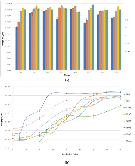 An MOI of 0.01 was observed to produce the maximum bacteriophage titer for k2a, k2b, k2w5 and k9coc, signifying that 0.01 was the optimal MOI for the bacteriophage titer production. This MOI produced lysates of more than 2 × 1010 pfu/mL. The optimal MOI for k2w6 and kp99 bacteriophages were 0.1, 0.001 for k9w5, while k9w6 show similar concentrations in all tested MOI (Figure 3a). This finding is in accordance with [36,37], where low MOI was found to be optimal for the propagation and high bacteriophage stock preparation. Lysates products were optimum when a higher bacteriophage concentration was obtained [38].