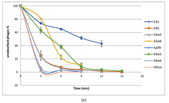 The bacteriophage rate of adsorption was determined by titrating the unadsorbed phages against the initial titer. The number of free bacteriophages in the suspension declined over time, as shown in the adsorption curve (Figure 3c). Within the first 3 min, k2a, k2w6 and k9w5 have adsorption rates of less than 40%; k2w5 and k2b have adsorption rates of more than 70%; and the most efficient are k9coc (98%), kp99 (96%) and k9w6 (93.4%) (Figure 3c). A study reported a higher absorbance of K. pneumoniae (99.7%), but this is after 5 min of incubation [40]. Most bacteriophages were completely adsorbed after 12 min, except k2a. The high adsorption rate of bacteriophages in the current study is higher than what was reported in a recent study targeting the Klebsiella bacteriophage, which also belongs to Podoviridae family [44]. Different families of bacteriophages have different adsorption rates, as shown in several studies [45], because of either the absence or presence of extra side tail fibers or an improved tail fiber, contributing to rapid adaptation of the bacteriophage population [46].