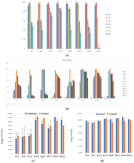 A neglectable reduction of bacteriophage activity was observed for k2a, k2w5, k2w6, kp99 and k9w5; on the other hand, there was a slight increment in k9w6 and k9coc bacteriophage concentration after treatment with chloroform. As a whole, chloroform exposure did not have any significant adverse effect on bacteriophages titers (Figure 4c). They remained unaffected by the 10% chloroform treatment after incubation for 1 h, just like bacteriophages in another study [40]. Based on these results, chloroform also did not render the bacteriophages inactive as they retained their plaque-forming ability. Small increases were obtained in k9w6 and k9coc concentration, which was regarded as an anomaly. A similar observation in a previous study was also reported [56]. These increases are not high and could derive from the dissociation of bacteriophage aggregates as discussed. The performance of bacteriophages sensitivity to chloroform was essential since bacteriophages are often treated with chloroform to preclude microbial contamination during storage [57].