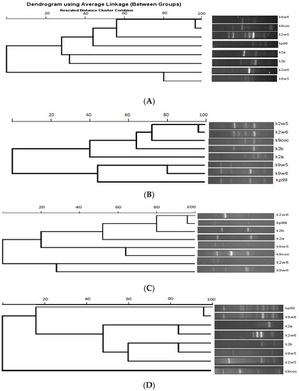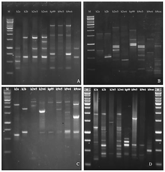 Figure 7 shows the dendrogram analysis of the bands. Figure 7B displays two main clusters. These clusters largely group the bacteriophages that have the same host of isolation. For example, k9coc, k9w5 and kp99 clustered together and shared KP9 as a host of isolation, while k2a, k2b, k2w5 and k2w6 share KP2 as a host of isolation. No correlation was found between bacteriophage morphology and RAPD-PCR clustering, as all bacteriophages belonged to Podoviridae, except one (Myoviridae). Notably, the correlation between genome size and a low number of bands was observed; k2a had a small size and a low number of bands, while k2w5 (87 kb) generated a high number of bands with all the primers assayed (Figure 7A–D).
