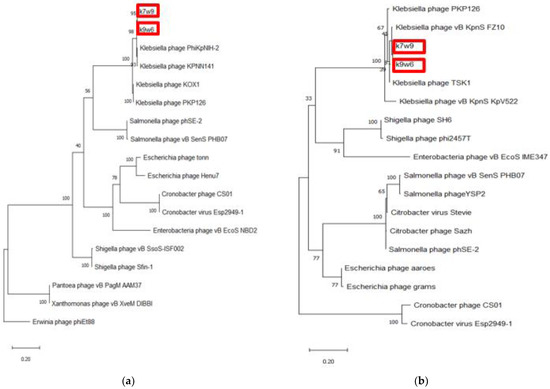 More than 25% of known dsDNA bacteriophages carry the DNA polymerase I (polA) gene, making the DNA polymerase I (polA) gene among the most broadly distributed bacteriophage genes. Due to its pivotal role in DNA replication, this enzyme is linked to characteristics of the bacteriophage lifecycle. It is a helpful marker for marking the diversity and composition of the virioplankton and could be a driving element in the divergence of bacteriophage replication components [77]. Again, by DNA polymerase tree, the k7w9 and k9w6 sequences were found to be most closely related to each other and also cluster closely with sequences from other Klebsiella bacteriophages (Figure 9). The next closest sequences in an adjacent cluster come from Enterobacter and Shigella bacteriophages. The hosts of these phages, alongside Klebsiella, are from the Enterobacteriaceae family of the Enterobacterales order. The next closely related sequence is from a bacteriophage of Pantoea, which is of the Erwiniaceae family of the same order.
