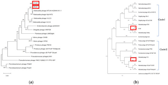 Bacteriophage tail fibers are elongated protein assemblies that can be recognized explicitly on bacterial surfaces during the first step of viral infection [78]. K9w6 and k7w9 bacteriophages were found to have different host ranges according to Clade I Clade II 185 monovalent and polyvalent action and different families, where k7w9 was related to the Siphoviridae family (data are not shown). To clarify these similarities, the tail fiber protein of k9w6 and k7w9 were compared with closely related Klebsiella and other bacterial bacteriophages proteins in the same phylogenetic trees. The analysis revealed that these two were separated into different monophyletic groups. Figure 10b shows the two clades. Clade I; comprises bacteriophages related to the Podoviridae family, k9w6 and Klebsiella bacteriophages involved in KP34-like viruses are clustered together in the tree, confirming that k9w6 is a podobacteriophage belonging to the Kp34-like virus genus Autographiviridae subfamily and is less similar to Proteus and Pectobacetriu. Clade II, including bacteriophages related to the Siphoviridae family, k7w9 is clustered next to (shelby) KP36 bacteriophage (siphoviruse) in the subfamily Drexlerviridae and is less similar to E. coli, Salmonella and Shigella bacteriophages. This suggests that bacteriophages in clade I or II may be closely related in terms of their evolution and have Podoviridae or Siphoviridae morphology. Broad- and narrow-host-range bacteriophages were found in all three families, Myoviridae, Siphoviridae and Podoviridae [70]. A similar result has been found where a variation in the tail fibre protein sequence associated to the host range differences between the two bacteriophages [79]. However, the detailed mechanisms underlying the interactions between binding proteins of the bacteriophage and receptors on the bacterial cell surface remains unknown. Although the host phylogenetic relation is not a definite indication of the bacteriophages being closely related, it is a point of reference as the possible evolution shift of a parasite usually results in an infection of species closely related to the natural host which supported host range result where k7w9 is polyvalent bacteriophage and infecting another bacterial species beside K. pneumoniae [16]. Most often, tail fiber and tail spike proteins display polysaccharide-depolymerase activity [80,81]. Some also have found that in several bacteriophages, the protein having the depolymerase domain was a part of bacteriophage structural proteins (mostly on tail fibers) and permits bacteriophage adsorption, invasion, and disintegration of the host bacterial cell [82]. Bacteriophages k9w6 and k7w9 were isolated from different sewage samples. The bacteriophages, as shown, have a different capsular specificity: k9w6 lyse K. pneumoniae of capsular type K2, and K57 and two strains of capsular K20, whereas bacteriophage k7w9 are lytic for strains of same capsular type, besides K53 and S.aureus, MRSA, P.aeruginosa and B.subtillis. The isolation of non-homology bacteriophages coding different tail fiber protein (degrading enzymes) from the different ecological environment shows that different environments contain different bacteriophages with possible isolation of new efficient bacteriophages with a broad host range. The DNA polymerase gene, terminase large subunit gene and Endolysin gene all supported that k9w6 and k7w9 were more closely related to each other than to other bacteriophages (no discrimination), but the observation of the tail fiber protein tree suggests that the tail fiber protein is a probable marker to identify the bacteriophages host range.