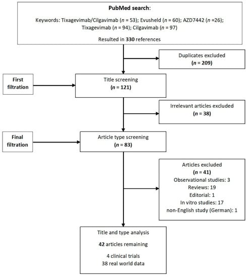 Broad searches of Pubmed, Scopus, and Embase between 1 February 2020 and 10 December 2022 were conducted using the following keywords: ‘Tixagevimab/Cilgavimab’, “Evusheld”, “AZD7442”, “Tixagevimab” and “Cilgavimab”. Relevant publications were identified based on the titles and abstracts. No restrictions on the type of paper were set. Only English language papers were included in this review and the main focus was put on the clinical data. Three reviewers independently screened all titles and abstracts and hand-searched the references of the retrieved articles. Duplicates and irrelevant articles were removed, and all disagreements were discussed and resolved (Figure 1).