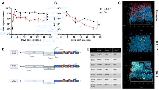 PBS with calcium and magnesium (Thermo Fisher Scientific, Waltham, MA, USA) was added to the apical side of MucilAir before infection with SARS-CoV-2. Of the nasopharyngeal sample, 50 µL testing positive for SARS-CoV-2 (B.1.1.7 or BA.1) was used to infect the apical side of the respiratory tissue. After infection, MucilAir was washed with MucilAir medium. Respiratory tissues were maintained at 33 °C. In the first week of infection, SARS-CoV-2 viruses apically released were collected every day. The following week, until the 25 days post-infection, they were collected twice per week. For the collection, 200 µL MucilAir medium was added on the apical side for 20 min at 33 °C and then stored at −80 °C for further analysis. The basal medium was changed twice per week. Viral RNAs were quantified by RT-qPCR and plaque assay of the apical wash were performed on Vero E6 (see below). On the last day of infection, MucilAir was fixed with 4% formaldehyde. The last apical washes collected were sequenced by next-generation sequencing.