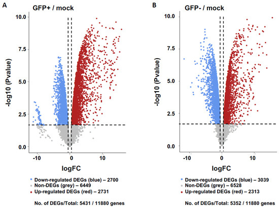 Our results showed 5431 and 5352 differentially expressed genes (DEGs) relative to healthy controls in the GFP+ and GFP− sample groups, respectively (Figure 1). When comparing DEG expression in both the GFP+ and GFP− groups, 44.62% were shown to overlap (Figure 2A) whilst 55.38% were unique. The top ten DEGs for the GFP+ and GFP− populations are shown in Table 1 and Table 2.