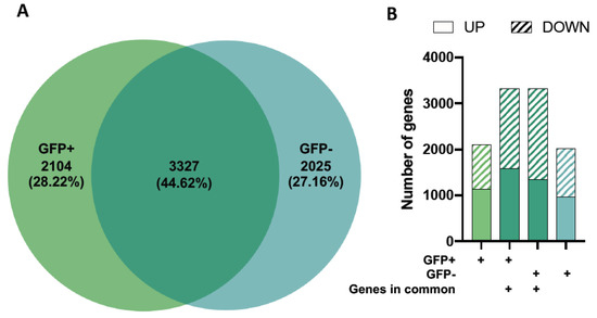 While we observed differences in gene expression levels of the overlapping genes for the GFP+ and GFP− groups (Table 1 and Table 2), the proportions of up-and downregulated DEGs were similar across all gene profiles (Figure 2B).