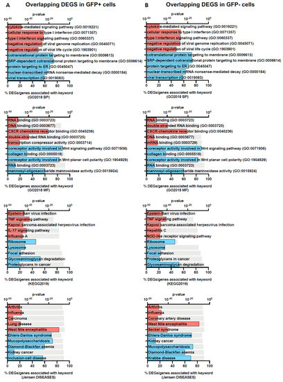 Gene-set enrichment analysis of overlapping DEGs in GFP+ and GFP− populations. The top 5 functional annotation for the two gene profiles: overlap-DEGs-GFP+ (A) and overlap-DEGs-GFP− (B) were identified using Enrichr with Gene Ontology Biological Process (GO2018 BP) and Molecular Function (GO2018 MF), KEGG and Jensen DISEASES databases. Keywords associated with up- and down-regulated genes are coloured red and blue, respectively. The grey bar represents the p-values determined by the Enrichr analysis platform.