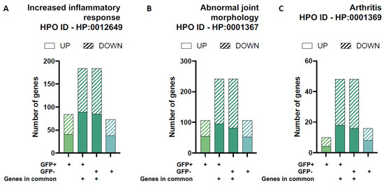 Differential gene expression for gene-sets related to joint pathology. The proportion of up- and down regulated differentially expressed genes (DEGs) in each of the four unique/overlapping gene profiles (GFP+ group only, overlapping genes in GFP+ cells, overlapping genes in GFP− cells and GFP− group only) were assessed using functional annotation gene-sets related to joint pathology from the Human Phenotype Ontology (HPO) database: increased inflammatory response (A), abnormal joint morphology (B) and arthritis (C).