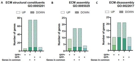 Differential gene expression for gene-sets associated with extracellular matrix (ECM) architecture and remodelling. The proportion of up- and down-regulated differentially expressed genes (DEGs) in each of the four unique/overlapping gene profiles (GFP+ group only, overlapping genes in GFP+ cells, overlapping genes in GFP− cells and GFP− group only) were assessed using functional annotation gene-sets related to extracellular matrix remodelling (ECM) from the Gene Ontology Biological Processes database (GO2018 BP): ECM structural constituents (A), ECM assembly (B) and ECM disassembly (C).