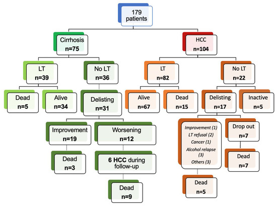 The flow chart presented in Figure 1 indicates that a total of 179 patients were included for study. The indication for LT was HCC in 104 (58.1%) patients and decompensated cirrhosis in 75 (41.9%) patients. The baseline characteristics of these patients at the start of treatment are described in Table 1. The majority of patients were male (145; 81.0%) with a median age of 54 years [IQR 51; 59 years]. Twelve (6.7%) patients had an HIV co-infection, while chronic alcohol consumption was associated with HCV infection in 39 (22.2%) patients. Some patients also presented with metabolic comorbidities: arterial hypertension (n = 44; 25.1%), diabetes (n = 48; 27.4%), and dyslipidemia (n = 8; 4.6%). In the overall study population, 59 (33.0%) patients presented with moderate or refractory ascites and 31 (17.3%) patients presented with encephalopathy. At baseline, the median MELD and Child–Pugh scores were 11 [IQR 8; 15] and 7 [IQR 5; 9], respectively.