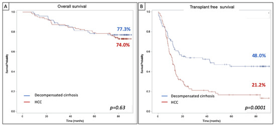 At the time of analysis, 121 (67.6%) patients had undergone LT: 82 (78.9%) from the HCC group and 39 (52.0%) from the decompensated cirrhosis group. Among patients who did not undergo LT, 19 were delisted for an improvement and 29 for a deterioration in their condition. Ten patients were still inactive on the transplant list at the end of follow-up. The median follow-up period was 84.5 months (95% CI; 83.6–85.4). Forty-four (24.6%) patients died during follow-up, but there was no significant difference in overall survival between patients enrolled for HCC or decompensated cirrhosis (77.3% vs. 74.0% for cirrhosis and HCC, respectively; p = 0.63) (Figure 2A). Transplant-free survival was significantly longer among patients with decompensated cirrhosis compared to those with HCC (42.4 vs. 12.1 months, respectively; p = 0.0001) (Figure 2B).