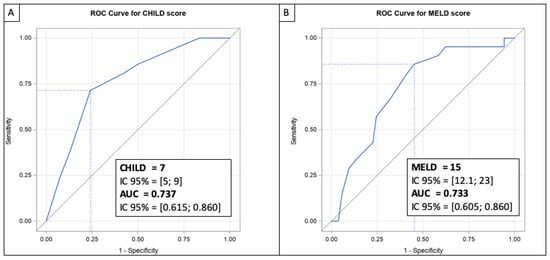 ROC curve for Child–Pugh score (A) and ROC curve for MELD score (B) to predict delisting after HCV treatment for an improvement in patients awaiting LT for decompensated cirrhosis.