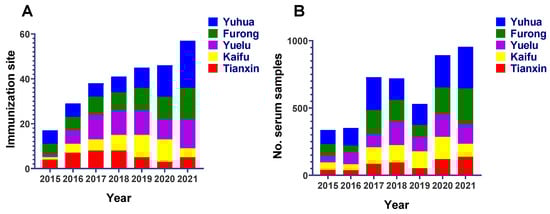During the seven years (2015–2021), 4515 samples were obtained from 57 sampling sites in five urban areas of Changsha. Overall, the number of immunization sites increased from 17 (2015) to 57 (2021), and the number of serum samples also showed an increasing trend between 2015 (336) and 2021 (955). The trends are shown in Figure 2 and the quantity is shown in Table 1. As mentioned earlier, the number of samples corresponding to different Characteristic varied due to the loss of related information caused by the lack of detailed recording of serum sample information at some immunization sites or the long-time span, and the specific number shown in Table 3.