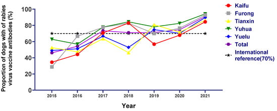 According to the World Health Organization, strengthening immunization against rabies is a fundamental measure to prevent rabies, and the effective prevention and control of rabies can be achieved if the immunization coverage rate is above 70% [21,22,23,24]. To investigate the effectiveness of rabies immunization in pet dogs in urban areas of Changsha, a total of 4515 dog serum samples were tested during 2015–2021. With the development of society and the increase in the number of pet owners, the test sites have increased significantly, accompanied by an increase in sample size. During the seven years, although the immunization effect in 2015 and 2016 was poor and the seroconversion did not reach the standard of 70%, the seroconversion was maintained at about 70% after 2017 and reached 90.23% in 2021. The results indicate that the vaccination of urban pet dogs has gradually matured, the prevalence and efficiency of immunization have been significantly improved, and an effective defensive barrier has been initially established. The increase in rabies seropositivity is mainly due to the enactment of relevant government policies and greater public awareness of rabies. The scope of this survey was five urban areas of Changsha, which was only limited to the metropolitan area of Changsha. The results could only reflect the rabies antibody level of pet dogs in the urban area but not the whole of Changsha. However, since Changsha is one of the new first-tier cities in China and is strategically located, this study has significant reference value for urban rabies control in other cities in China and even in developing countries where dog rabies exists as India and Brazil.