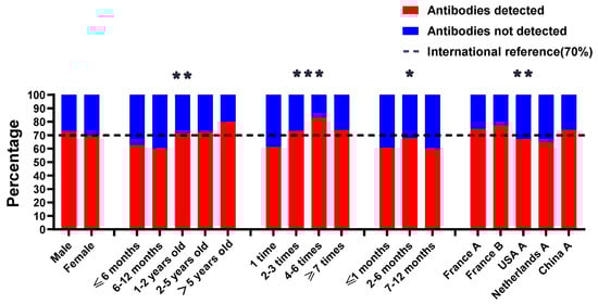 A total of 1182 serum samples with definite vaccination time and sampling time were statistically analyzed and classified into three categories according to the sampling time after vaccination, within 1 month, 2–6 months and 7–12 months. The test results showed that the seroconversion was 60.67% (182/300), 67.97% (399/587), and 59.66% (176/295), respectively (Table 4). The results showed that the time interval after the most recent vaccination and sample collection was associated with the seropositivity rate (p = 0.0194 *, < 0.05) (Figure 4).