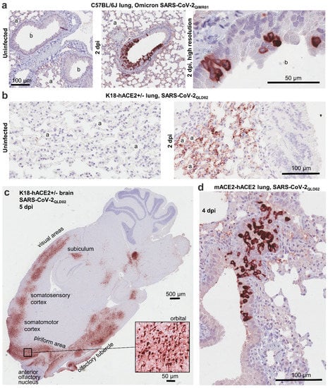 Immunohistochemistry (IHC) was conducted on lung tissues from 3 mouse models and brain tissues from one mouse model, with mice infected with an omicron BA.1 isolate, SARS-CoV-2QIMR01, or an original strain isolate, SARS-CoV-2QLD02. A number of SARS-CoV-2 variants, including omicron, can use the mouse angiotensin-converting enzyme 2 (mACE2) receptor and are thus able to infect wild-type mice [34]. IHC using SCV2-1E8 of lungs from C57BL/6J mice infected with the omicron BA.1 isolate, clearly showing infection of bronchial epithelial cells (Figure 1a), consistent with previous reports [35,36].