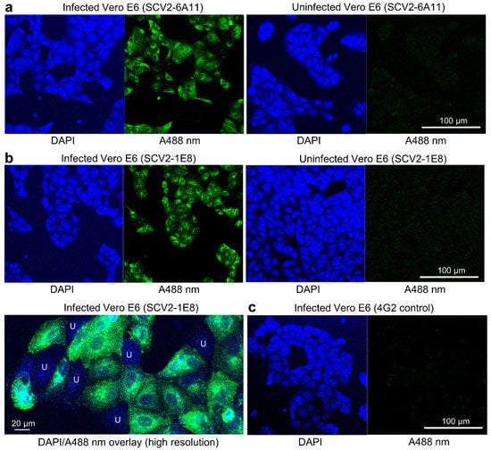 Vero E6 cells have been widely used for in vitro infections with SARS-CoV-2 [18,44]. Indirect Immunofluorescent Assay (IFA) staining of SARS-CoV-2QLD02-infected Vero E6 cells using mAbs SCV2-6A11 and SCV2-1E8 and confocal microscopy shows clear patterns of cytoplasmic staining (Figure 2a,b). The IFA staining clearly distinguished between infected cells (Figure 2b, bottom left, green) and uninfected cells (Figure 2b, bottom left, U—blue DAPI staining with no green). Staining these infected cultures with a flavivirus-specific mAb as a negative control, instead of SCV2-6A11/SCV2-1E8, showed little or no signal (Figure 2c).