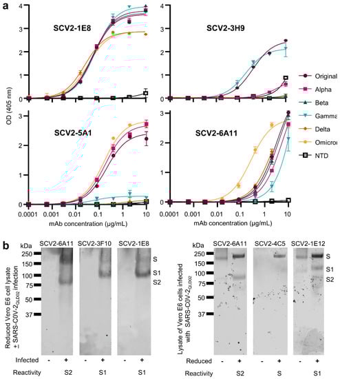 Standard ELISAs were undertaken using SARS-CoV-2 recombinant spike proteins from each variant of concern as antigens. These recombinant spike proteins were stabilized via six proline substitutions and mutated furin cleavage sites, and were expressed in Expi293-F™ cells [29,45]. The N-terminal domain (NTD) of the spike protein from the original strain was also used as an antigen [29]. ELISA analyses confirmed that the mAbs generated from these hybridoma fusions were directed to the spike protein. Three mAbs bound RBD, while eight had reactivity to NTD. Ten of the mAbs bound all variant spike proteins tested. A summary of the data generated from these experiments is shown in Table 1. Titration curves for purified mAbs used in other applications in this paper are shown in Figure 3a. For instance, the mAb used in Figure 1, SCV2-1E8, recognizes all variants of concern (but not the NTD) and has a IC50 of ≈0.1 µg/mL (Figure 3a). Titration curves for the remaining mAbs (Table 1) are shown in Supplementary Figures S2 and S3. ELISA titrations using the recombinant Receptor Binding Domain (RBD) [29] as antigen are shown in Supplementary Figure S4a. The utility of several mAbs in fixed cell ELISAs are shown in Supplementary Figure S4b.