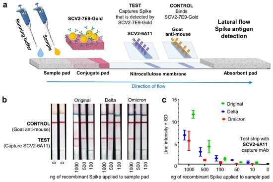 Lateral flow spike antigen detection applications. (a) Setup of the lateral flow spike antigen detection system (generated using BioRender). Sample (containing recombinant spike) is applied followed by running buffer, which carries the antigen and mobilizes the gold-conjugated SCV2-7E9 mAb. Spike bound to SCV-6A11 (the capture mAb) is then detected by SCV2-7E9-Gold. The control binds the SCV2-7E9-Gold illustrating that the detection-mAb has been mobilized. (b) The SCV2-7E9-Gold is visualized as a red band that illustrates the presence of recombinant spike in the sample (TEST), with a red CONTROL line illustrating that the detection mAb (SCV2-7E9-Gold) has been mobilized. (c) Quantitation of antigen detection by the lateral flow test for recombinant spike antigens from each of 3 variants of concern. (SD from n = 3 replicates).
