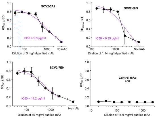 Neutralizing antibody titers were determined for a selection of purified mAbs using Vero E6 cells and a CPE-based assay in 96 well plates [19,21], with the flavivirus specific mAb 4G2 used as a negative control. Neutralization curves against an original strain isolate, SARS-CoV-2QLD02, are provided; SCV2-5A1 and SCV2-3H9 showed the highest potency with the concentrations of mAb providing 50% neutralization (IC50) at ≈3 and 0.35 µg/mL, respectively (Figure 5). SCV2-7E1/4 also showed neutralizing activity; however, yield from this hybridoma was low (Supplementary Figure S5). Of those mAbs that were neutralizing, mAb SCV2-7E9 showed the lowest potency with an IC50 of 14.2 µg/mL (Figure 5).