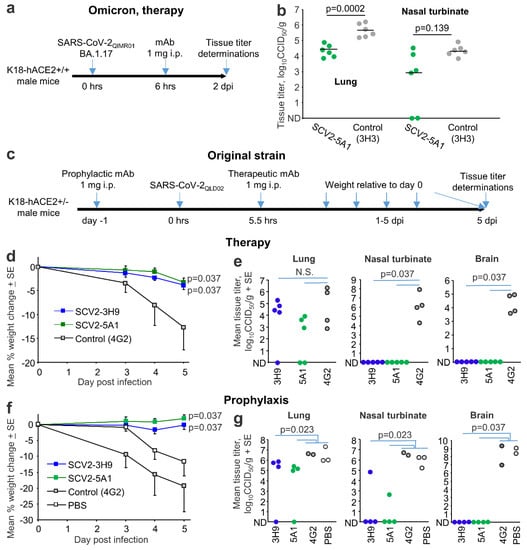 Treatment of mice infected with an original strain isolate, SARS-CoV2QLD02 with SCV2-5A1 and SCV2-3H9, was also investigated, with the 5 dpi time point chosen as this represents the ethically defined end point in this lethal model (Figure 6c). Therapeutic treatment significantly reduced the infection-associated weight loss (Figure 6d) and reduced nasal turbinate and brain titers to below detection, but had no significant effect on lung titers (Figure 6e). Prophylaxis also significantly reduced weight loss (Figure 6f), and significantly reduced viral titers in all tissues tested (Figure 6g). (We also illustrate in this experiment that PBS behaved similarly to the 4G2 control mAb; Figure 6f,g). These results are broadly comparable with previous studies evaluating anti-spike mAbs in COVID-19 mouse models [48,49,50,51].