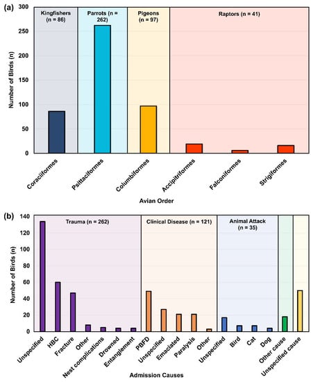 2.3. Sampled Avian Species and Hospital Admission Causes