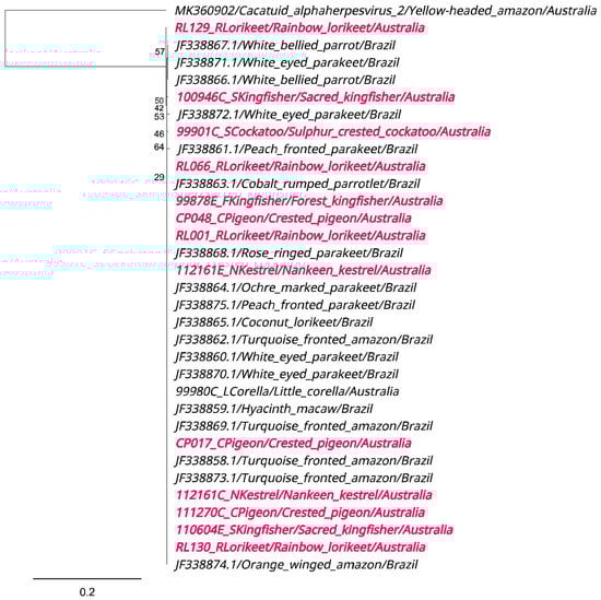 Phylogenetic relationships between 14 PsAHV1 UL16/17 gene sequences detected from various avian species in this study and 19 Brazilian reference sequences. The ML phylogenetic tree was constructed using IQTREE2, using cacatuid alphaherpesvirus 2 strain 97-0001 (MK360902) as the outgroup. Branch tip labels show the GenBank accession number/common name/country of origin. PsAHV1 sequences detected from this study are also coloured in pink and boldened, while reference sequences remain in regular font and are coloured black. The scale bar indicates the number of nucleotide substitutions per site. Bootstrap values are shown as a percentage on the left.