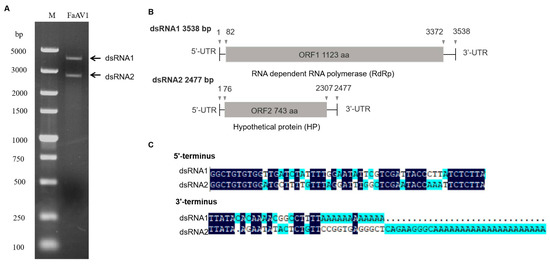 Double-stranded RNAs (dsRNAs) extracted from Fusarium avenaceum strain GS-WW-224. (A) 1.0% (w/v) agarose gel electrophoretic profiles of dsRNA extracted from F. avenaceum strain GS-WW-224, which was treated with DNase I and S1 nuclease. Lane M: DNA molecular marker DL 5000. (B) Schematic representation of the complete genome of Fusarium avenaceum alternavirus 1 (FaAV1), with open reading frames (ORFs) and coding regions indicated by gray boxes and triangles, respectively. (C) Sequences of the 3’- and 5’- untranslated regions (UTRs) of FaAV1 with identical nucleotides indicated in dark blue.
