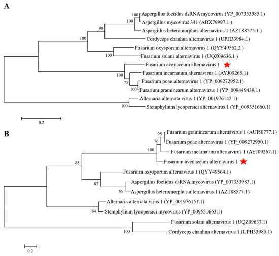 Phylogenetic trees constructed based on the amino acid (aa) sequences of RNA-dependent RNA polymerase (RdRp) and hypothetical protein (HP) of Fusarium avenaceum alternavirus 1 (FaAV1) and related viruses in the proposed family Alternaviridae using the maximum-likelihood (ML) method with 1000 bootstrap replicates. (A) Phylogenetic tree constructed based on the aa sequences of RdRp. Bar scale represents a genetic distance of 0.2 aa substitutions per site. Bootstrap values greater than 50% are shown above the branches. Red star indicates the position of FaAV1. (B) Phylogenetic tree constructed based on the aa sequences of HP. Bar scale represents a genetic distance of 0.2 aa substitutions per site. Bootstrap values greater than 50% are shown above the branches. Red star indicates the position of FaAV1.