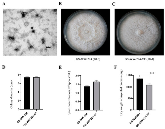 Virions of Fusarium avenaceum alternavirus 1 (FaAV1) and colony morphology, colony diameter, spore concentration, and dry weight of mycelial biomass of Fusarium avenaceum strains GS-WW-224 and GS-WW-224-VF. (A) Transmission electron microscope (TEM) image of virions of FaAV1 indicated by a black arrow. Scale bar = 50 nm. (B) Colony morphology of strain GS-WW-224 cultured on potato dextrose agar (PDA) plates for ten days at 25 °C in the dark. (C) Colony morphology of strain GS-WW-224-VF cultured on PDA plates for ten days at 25 °C in the dark. (D) Average colony diameter of strains GS-WW-224 and GS-WW-224-VF incubated on PDA plates for seven days at 25 °C in the dark. (E) Average spore production in strains GS-WW-224 and GS-WW-224-VF cultured on PDA plates for seven days at 25 °C in the dark. (F) Average dry weight of mycelial biomass generated in strains GS-WW-224 and GS-WW-224-VF cultured in potato dextrose broth (PDB) for seven days at 25 °C in the dark. Asterisks indicate different levels of significant difference (*** p < 0.001) between the two strains as determined by paired t-test using GraphPad Prism version 8.0 software.