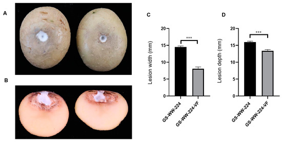 The pathogenicity of strains GS-WW-224 and GS-WW-224-VF was determined as previously described [47] with minor modifications by inoculating healthy potato tubers (cv. Favorita) that were uniform in size (25–30 g per tuber) with spore suspensions adjusted to the concentration at 106 spores/mL. Briefly, potato tubers were first disinfected by immersion in 0.5% sodium hypochlorite solution (NaClO) for 5 min, followed by three washes with sterile distilled water, and then air dried. Potato tubers were wounded (4 mm in width and 10 mm in depth) using a sterile cork borer and then spore suspensions were pipetted into the wounds (10 μL per potato tuber). An equivalent amount of sterile distilled water was added into wounded potato tubers, which served as a control. The treated potato tubers were placed in a sealed plastic box and incubated in a growth chamber at 25 °C and 90% relative humidity in the dark for seven days. The width and depth of lesions on each of the treated tubers were measured after seven days of incubation. The assay utilized three biological replicates, with ten potato tubers per replicate, and the test was repeated twice. A paired t-test was performed to determine significant statistical differences (* p < 0.05; ** p < 0.01; *** p < 0.001; **** p < 0.0001) between strains using Graphpad Prism version 8.0.