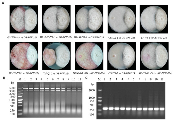 Horizontal transmission of the mycovirus Fusarium avenaceum alternavirus 1 (FaAV1) through hyphal contact in paired (donor-recipient) cultures. (A) Colonies formed in paired cultures of Fusarium avenaceum strain GS-WW-224 (donor strain, on the right) and each strain (recipient strain, on the left) obtained from ten other species of Fusarium. (B) Confirmation of the presence of FaAV1 in the derivative strains of the ten other species of Fusarium by 1.0% (w/v) agarose gel electrophoretic profiles of double-stranded RNA (dsRNA). Lane M: DNA molecular marker DL 5000; lane 1: The dsRNA extracted from F. acuminatum strain GS-WW-4-4; lane 2: The dsRNA extracted from F. brachygibbosum strain HLJ-MD-YL-1; lane 3: The dsRNA extracted from F. equiseti strain HB-SZ-XJ-1; lane 4: The dsRNA extracted from F. flocciferum strain GS-DX-1; lane 5: The dsRNA extracted from F. graminearum strain YN-YJ-2; lane 6: The dsRNA extracted from F. oxysporum strain HB-TS-YT-1; lane 7: The dsRNA extracted from F. proliferatum strain YN-QJ-2; lane 8: The dsRNA extracted from F. redolens strain NMG-WL-SD; lane 9: The dsRNA extracted from F. sambucinum strain GS-DX-2; lane 10: The dsRNA extracted from F. solani strain GS-TS-ZL-G-1; lane 11: The dsRNA extracted F. avenaceum strain GS-WW-224. (C) Confirmation of the presence of FaAV1 in the derivative strains of the ten other species of Fusarium by reverse transcription-polymerase chain reaction (RT-PCR) analysis of dsRNA using FaAV1-specific primers (dsRNA2-gap-1F and dsRNA2-gap-1R) in 1.0% (w/v) agarose gel electrophoresis. Lane M: DNA molecular marker DL 2000; lane 1: Products of RT-PCR from F. acuminatum strain GS-WW-4-4; lane 2: Products of RT-PCR from F. brachygibbosum strain HLJ-MD-YL-1; lane 3: Products of RT-PCR from F. equiseti strain HB-SZ-XJ-1; lane 4: Products of RT-PCR from F. flocciferum strain GS-DX-1; lane 5: Products of RT-PCR from F. graminearum strain YN-YJ-2; lane 6: Products of RT-PCR from F. oxysporum strain HB-TS-YT-1; lane 7: Products of RT-PCR from F. proliferatum strain YN-QJ-2; lane 8: Products of RT-PCR from F. redolens strain NMG-WL-SD; lane 9: Products of RT-PCR from F. sambucinum strain GS-DX-2; lane 10: Products of RT-PCR from F. solani strain GS-TS-ZL-G-1; lane 11: Products of RT-PCR from F. avenaceum strain GS-WW-224.