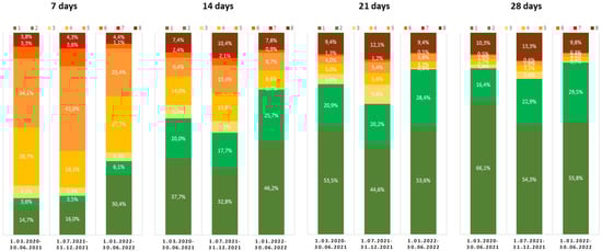 Comparison of the frequency of discharge from hospitals during the 7, 14, 21, and 28 days of observation in the periods of dominance of particular variants.
