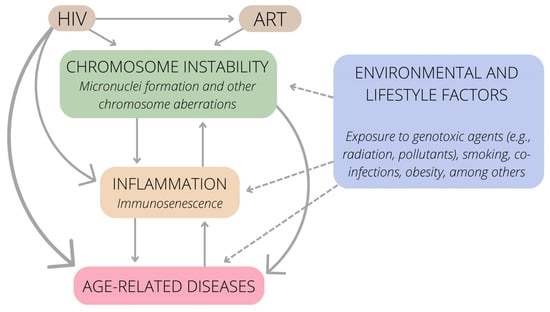 HIV drugs are also associated with chromosome instability []. People living with HIV, even on antiretroviral therapy (ART), suffer from chronic diseases and conditions associated with aging (e.g., cancer and cardiovascular and neurodegenerative diseases) at an increased rate compared to uninfected people. This indicates that HIV facilitates the occurrence of age-related diseases, independently or in association with other risk factors, potentially through the exacerbation of chronic inflammation, cellular senescence, mitochondrial dysfunction, telomere attrition, stem-cell exhaustion, DNA damage, and genomic instability []. Chronic inflammation is a major issue for HIV-infected individuals, and is caused by dysbiosis, microbial translocation, co-infections, and residual HIV replication, among other factors. As mentioned above, these conditions are commonly observed even in HIV-infected individuals undergoing ART [,,,].
