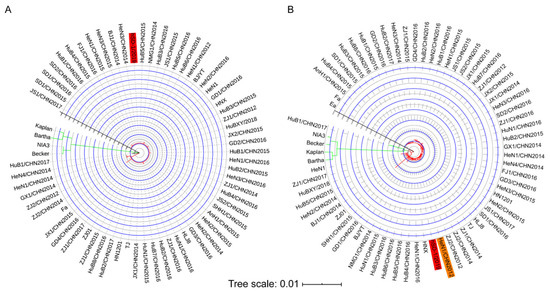 The whole-genome sequences used for the analyses in this study included those of 55 pig epidemic strains that we isolated in China between 2011 and 2018 [6], as well as those of several other pig-originated epidemic strains in China. The genome sequences of all of these PRV strains were retrieved from NCBI, and their GenBank accession numbers are listed in Table S1 in the Supplementary Materials.