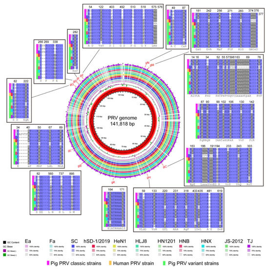 Circle map showing complete genome sequence alignments of human-originated and pig-originated PRV strains. Alignments of amino acid sequences of glycoproteins between different PRV strains were also displayed. Only sites with different amino acid residues are shown.
