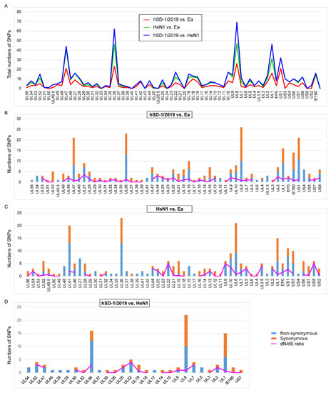 To explore the diversifying selection of different PRV types, the SNPs of the human-originated PRV strain hSD-1/2019, a pig PRV variant strain HeN1 (GenBank accession no. KP098534), and a classic PRV pig strain Ea (GenBank accession no. KX423960) were determined by using MUMmer software (version 3.23) [32]. A total of 508, 363, and 258 SNPs were identified in the genomes of HeN1, hSD-1/2019, and hSD-1/2019 compared to the genomes of Ea, Ea, and HeN1, respectively (Table 2). By using a local Perl command described previously [33], the coding effects of these SNPs were determined. Compared to the genome sequence of Ea, 292 SNPs determined in the genome sequence of hSD-1/2019 had coding effects, of which 153 SNPs were identified as non-synonymous SNPs and 139 SNPs were identified as synonymous SNPs (Table 2). The overall ratio between the non-synonymous to synonymous substitutions (dN/dS) of all of the coding regions of strain hSD-1/2019 compared to strain Ea was 1.10 (Table 2). In total, there were 257 SNPs with coding effects in the genome sequence of HeN1 compared to that of Ea, with 145 SNPs being identified as non-synonymous SNPs and 112 SNPs being identified as synonymous SNPs (Table 2). The dN/dS ratio between the two genome sequences was 1.29 (Table 2). Only 101 SNPs in the genome sequence of hSD-1/2019 compared to that of HeN1 were determined to have coding effects, among which 56 SNPs and 45 SNPs were identified as non-synonymous SNPs and synonymous SNPs, respectively (Table 2). The dN/dS ratio between the two genome sequences was 1.24 (Table 2). Among different comparisons (hSD-1/2019 vs. Ea; HeN1 vs. Ea; hSD-1/2019 vs. HeN1), the highest numbers of SNPs were observed in several genes such as UL47, UL36, UL8, UL1, and US1 (Figure 4). In addition, high dN/dS ratios were observed in several glycoprotein-encoding genes, such as US8, which encodes gE (Figure 4B–D).