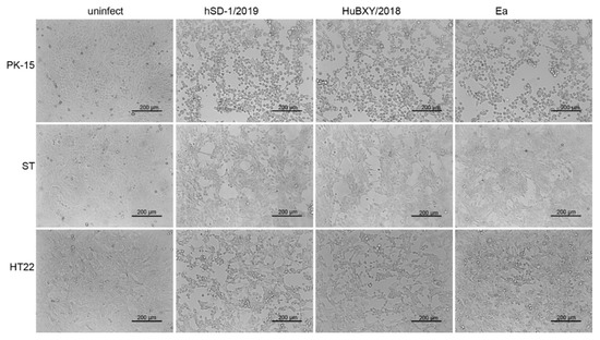 The cell monolayers were infected with PRV hSD-1/2019 (human-originated strain), HuBXY/2018 (pig-originated clinical variant strain), or Ea (pig-originated clinical classic strain) at 5 MOI and were incubated at 37 °C. At 12 h post-infection, the cytopathic effects were observed and recorded using the EVOS® FL Auto Imaging System (Thermo Fisher Scientific, Waltham, MA, USA).