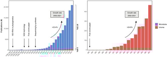 Number of publications in microbiome and virome research. Number of publications were determined by querying the search term “Microbiome [TITLE/ABSTRACT]” and “Virome [TITLE/ABSTRACT]” on PubMed. In the year 2000, the first next-generation sequencing technology (e.g., massive-parallel sequencing) was launched, along with the first microbiome publication on PubMed. The first virome publication was published in 2003 on PubMed. In the last decade (2010–2021), the microbiome and virome research showed an exponential increase in publications with an average growth rate of 33.4% and 28.1% per year, respectively. Nonetheless, in 2021, virome studies constituted only a small fraction (3.54%) of the total microbiome publications.