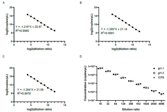 Detection with different sets of primers and probes by the ddPCR (A,C). There was a good linearity between the logarithm of the genomic copy number and the logarithm of the dilution ratio when using primer pairs gH-1 (A) and gH-2 (B) of the gH gene and ICP8 (C) primer pairs of the ICP-8 gene for detection. (D) There was little difference in genomic copy numbers when using different primer pairs to detect samples with the same fold dilutions (p > 0.05). The x-axis represents the dilution ratio, and the y-axis represents the copy numbers of samples. The genomic copy numbers using different primer pairs to detect samples with the same fold dilutions were compared using T test.