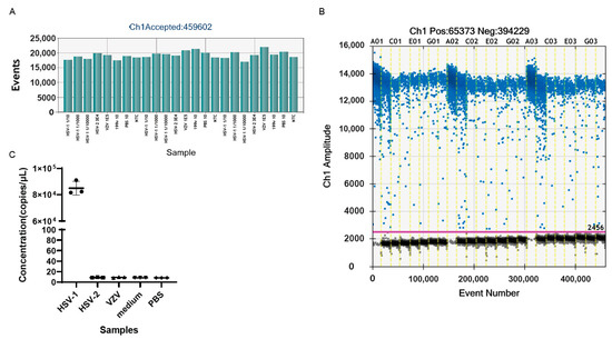 The specificity of gH primers and probes. (A) The total number of droplets of samples generated by ddPCR in the experiment of (C). The numbers exceeded 10,000, indicating that the experimental results were credible. (B) The one-dimensional (1D) amplitude of the samples in the experiment of (C). The positive droplets were labeled with blue dots, while the negative droplets were labeled with black dots. The threshold was indicated by the pink line. (C) The genomic copy numbers of oHSV-1, HSV-2, VZV, medium, and PBS. Every dot in the figure represents a technical replicate. The primers and probes used in the above experiments were gH-F1, gH-R1, and gH-P1. Evens: the total number of droplets. Ch1 amplitude: the fluorescence intensity of every droplet. NTC: no template control.